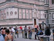 サンタ・マリア・デル・フォーレの大聖堂の外壁。何処の観光地も似た光景がある。似顔絵画きの露天商。装飾品の販売など。 |